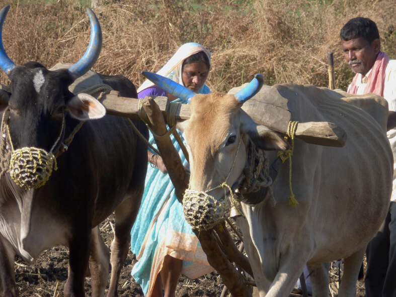 From there the series returns to the ground—fields, bodies, crops, labour—in FARMER/LABOURER. Here the agricultural world appears first as beauty: furrows, green plots, cotton, bullocks, grain carried home. But the film immediately unsettles this beauty.